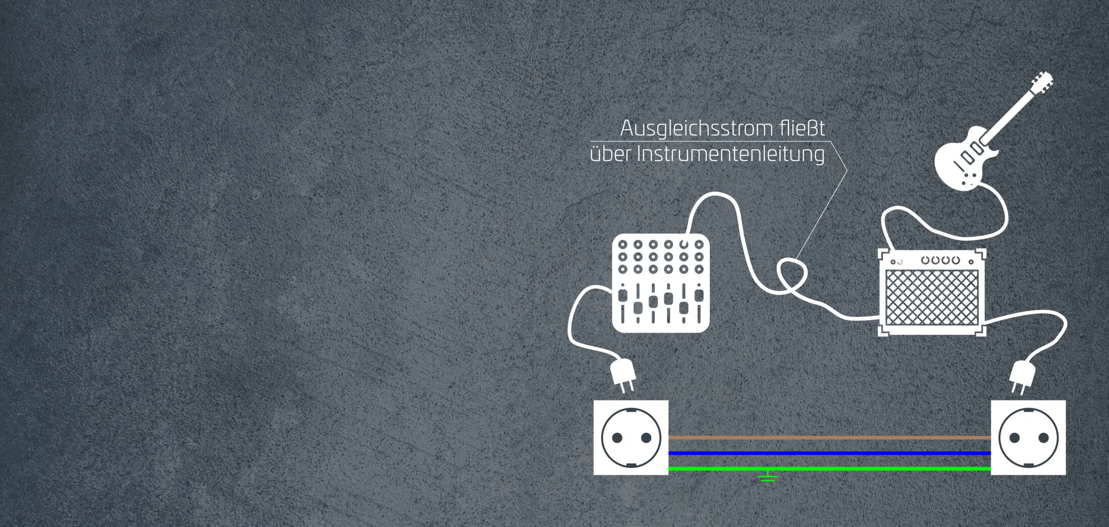 Und das geht so: dieses Brummen aus dem Verstärker oder dem Mischpult ist sozusagen Strom, den man hört. Einerseits viele verschiedene Stromquellen, andererseits viele verschiedene Geräte, die alle eigens geerdet sind und an den Steckdosen hängen (also unterschiedliche Stromkreise/Potentiale). Und dazwischen ein Instrumentenkabel. Jetzt wird das Audiokabel also quasi zur Überbrückung von 2 geerdeten Steckdosen – und das hört man, denn über die Schirmung (Masse) des Kabels fließt dann der sogenannte Ausgleichsstrom, den man als niederfrequentes Störsignal wahrnehmen kann. Der Fachmann spricht hier von der Erdschleife.
