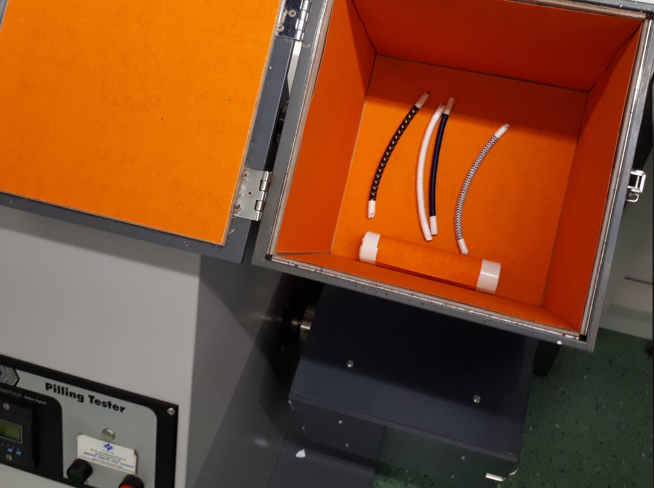 Nachdem die Schnittkanten der Muster abgeklebt wurden (gegen Scheuerung an den Kanten), hat das Labor Tests in einer sogenannten "Pillingbox" durchgeführt. Einmal gab es einen Test in einer "normalen" Box mit Korkwandungen, zum andern wurden die Wandungen mit Schleifpapier verkleidet und ein weiterer mit Schleifpapier umwickelter Scheuerkörper neben den Mustern platziert. Durch Drehen der Box in voreingestellten Zyklen wurden dann Scheuerkontakte untereinander, sowie mit den Wandungen, erzeugt und damit Materialbeanspruchung simuliert.