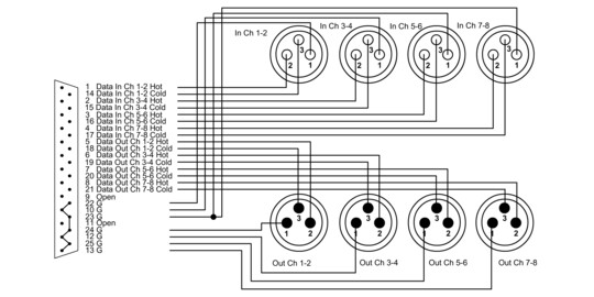 Das CFD DFMY ist ein professionelles digitales Multicore-Kabel (AES/EBU) für Live -und Studioanwendungen. Die Belegung entspricht der digitalen DSUB 25 Spezifikation von YAMAHA, von einem D-Sub 25pol Stecker male auf vier XLR male / vier XLR female. Die XLR-Steckverbinder sind 3-polig belegt. Alle Stecker haben ein vernickeltes Metallgehäuse.