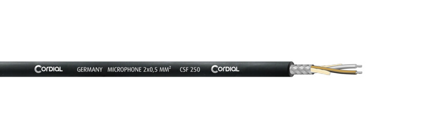 Im Rahmen von Installationen und im Tonstudio-Ausbau wird die Cordial Meterware CSF 250 eingesetzt. Unverfälschte und qualitativ hochwertige Signalübertragung ist in Aufnahmestudios essenziell. Ein wichtiger Faktor sind dabei geringe Widerstandswerte, die durch einen hohen Leiterquerschnitt erreicht werden. Gerade bei längeren Leitungswegen (z.B. in Kabelkanälen) vom Aufnahmeraum zum Pult leidet ansonsten die Qualität des mikrofonierten Signals. Das CSF 250 bietet 2x 0,5mm² (AWG 21) Leiterquerschnitt für geringe Widerstandswerte und Übertragungen ohne Höhenverluste. 64 verzinnte Kupferlitzen mit 0,10mm Durchmesser sorgen für hohe Flexibilität, auch in Kabelkanälen. Der Biegeradius beträgt bei Festinstallationen nur ~27 mm. Ein Geflecht aus verzinnten Kupferdrähten schirmt dieses Kabel gegen störende Einflüsse von außen ab.