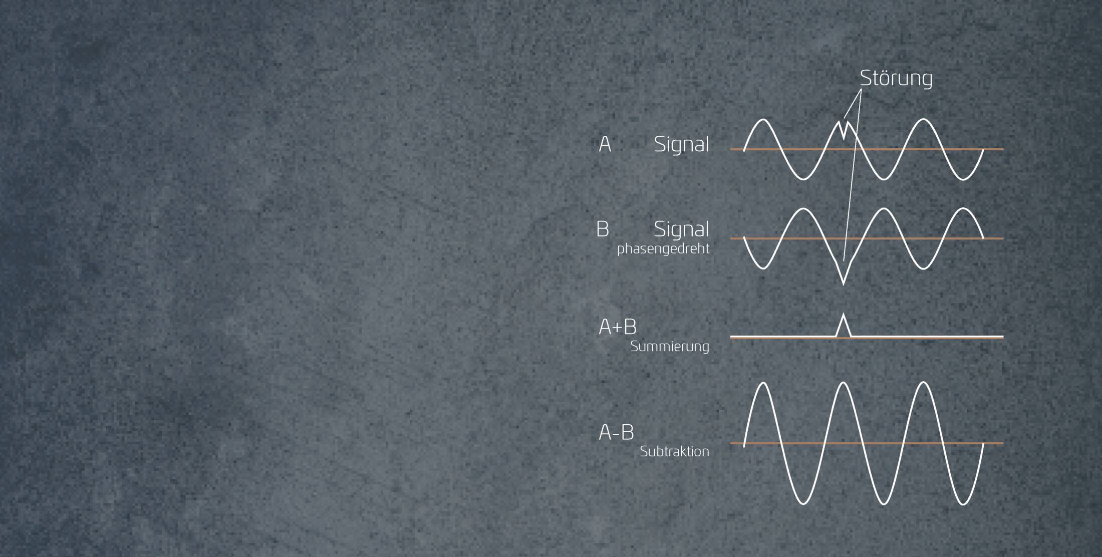 A balanced cable comprises two conductors for the useful signals and an earth conductor, which is used as shielding. The signal conductors are in phase opposition (one for "minus", one for "plus") and are usually twisted to optimize the electromagnetic properties (twisted pair cable). This polarity reversal (phase shift by 180° - in the input of the receiver device the polarity of the signal of one wire is reversed) eliminates interfering signals from outside and thus only the pure useful signal remains. Therefore, balanced cables are particularly suitable for longer signal paths. The most common balanced cables types are microphone cables (XLR cables) and the stereo mini jack cables known as "AUX" cables, which are used, for example, as a connection between a cell phone and a hi-fi system or mixing console. Another advantage of a balanced cable is that phantom power can be fed through it as supply voltage (e.g. for condenser microphones or active DI boxes).