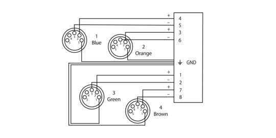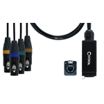 It is equipped with the 5-pin version of black female NEUTRIK® XLR metal connectors. After a 70 cm split, each single cable is TIA 568 A color-coded and ends in a special metal socket providing strain relief and kink protection based on the tried-and-tested NEUTRIK® NE8FF.
