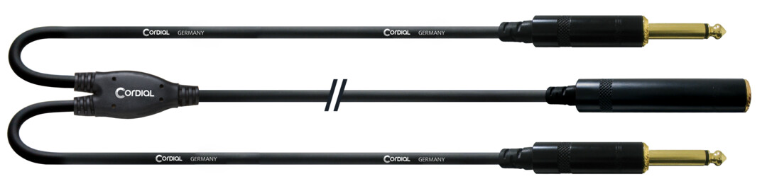 The CFY GPP 1x 6.3 mm mono jack socket to 2x 6.3 mm mono jack plug adapter cable is used whenever you need to merge 2x mono into 1x mono, for example when splitting mixer signals.