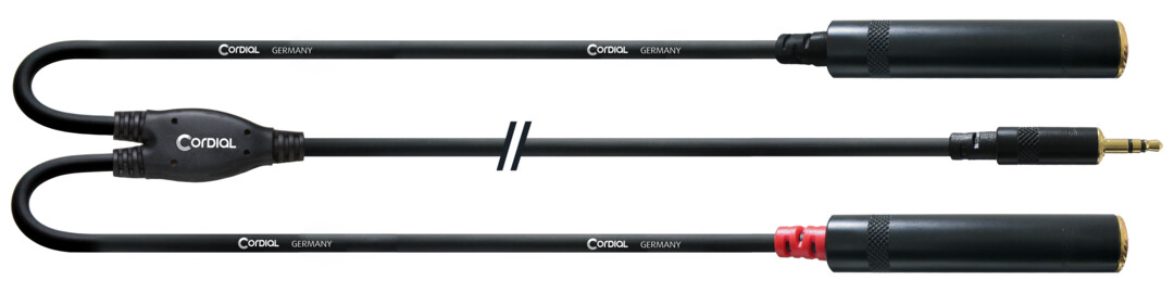 The 1x 3.5 mm stereo mini jack plug to 2x mono jack socket 6.3 mm adapter cable CFY WGG should never be missing in any studio or from any event toolbox. The hand soldered REAN made by Neutrik®mono jack plugs feature a red respectively a black left/right marking. The contacts are gold plated to protect against corrosion and the cross section of the adapter cable is 2x 0.22mm².