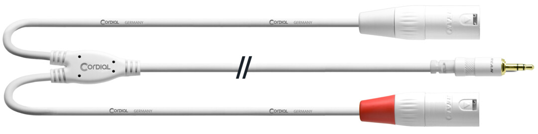 Here, too, the plug arrangement is 1x 3.5 mm stereo jack to 2x male XLR. The split at the two cable ends is approx. 15 cm long and the two XLR connectors feature a red and a white marking. The white metal connectors (REAN made by Neutrik®) are hand soldered. The cable has a cross-section of 2x 0.22mm².