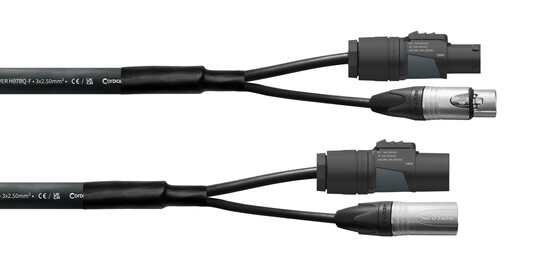 The DMX cable in question can cope the transmission of digital signals in 110 Ω AES/EBU and DMX format without any problems, even over longer distances. The H07RN-F rubber cable used for the power cable is a good choice for outdoor events. This robust rubber cable, also known as "heavy rubber cable", is flexible and reliable and meets the highest demands.