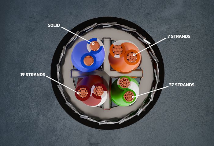 The screen of multicores is often tinned which makes further processing considerably easier. Furthermore, we distinguish between separately screened pairs (single screen) and overall screened (overall screen) cables.